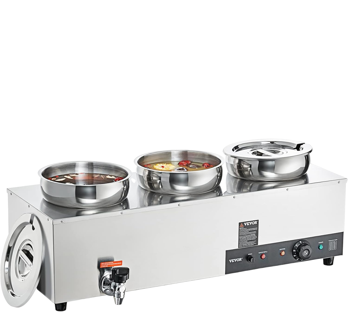 Additional Security: We have upgraded our bain marie with newly designed “Dry Burning Indicator” and “Reset Button”. The dry-burning indicator function automatically stops heating the food when the temperature exceeds 248°F (120°C). To resume operations, simply refill the water and press the Reset Button.
